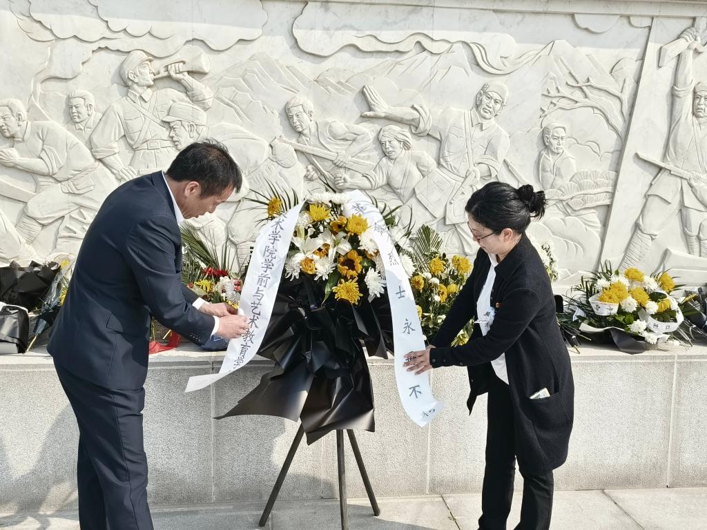 全体人员在纪念碑广场整齐列队,在庄严肃穆的国歌声中,致敬英烈祭扫仪式拉开帷幕。学院党总支书记王春生和教师党支部书记耿润向纪念碑敬献花篮,全体人员三鞠躬向英烈们致敬,肃立默哀三分钟致以深切缅怀。