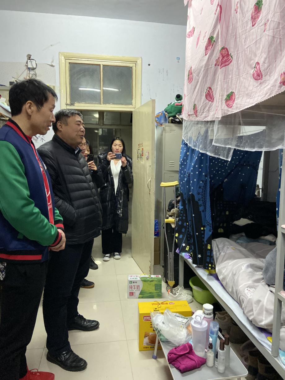2019年12月16日晚自习放学后,十大买球官方网站党总支书记王爱东、副院长王春生、高岐奎、学管办主任崔彤彤及辅导员来到女生宿舍7571房间看望慰问2018级学前教育一班的青海学生李瑞,为她带来关爱与温暖。
