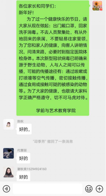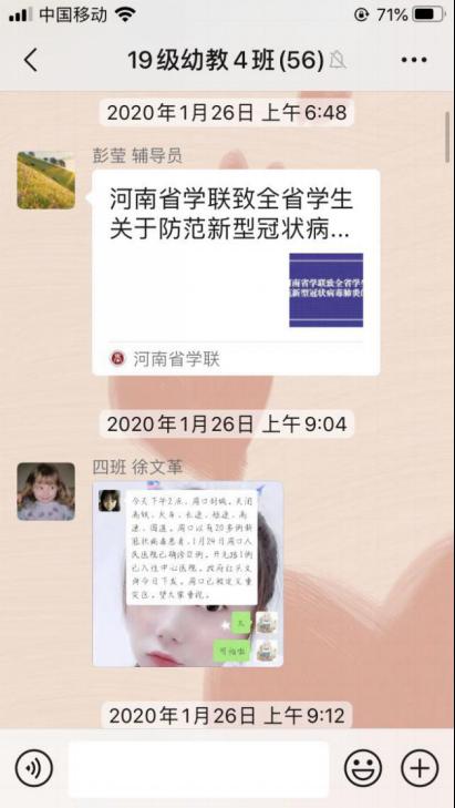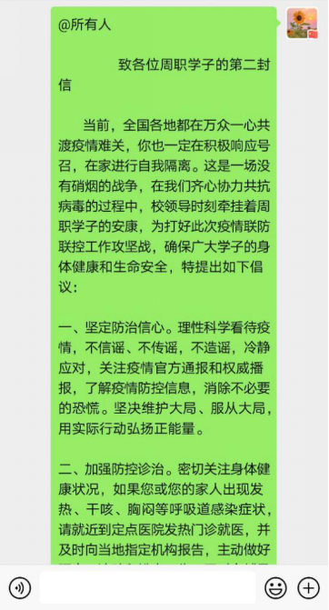 疫情期间,普及防疫知识,是我们的辅导员每天必须要做的事情。辅导员每天都会在班级群里发布最新疫情相关信息,积极宣传病毒防护知识,提醒学生预防措施,做好居家防护,提升学生对新冠病毒的认识,加强自我管理。比如,向17级、18级、19级共34个班的学生分别发送了:致各位周职学子的一封信、第二封信、致全体师生员工做好疫情防控工作的倡议书、相关文件通知、新冠病毒预防知识等相关链接,并且进行了重点解读,明确关键性要求。同时,针对网上出现的谣言,及时做好舆情引导,向学生传递真实的官方信息。