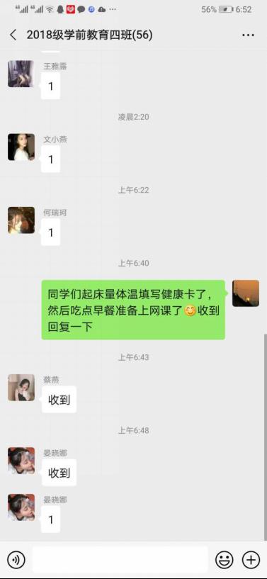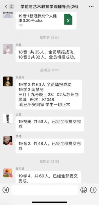 学生的健康状况更是不容忽视,有些同学上报的健康状况异常,在得知消息后,辅导员第一时间联系了学生及其家长,并向领导反映情况;当时田钰老师班级里有一名学生扁桃体发炎并发烧,她每一天都会跟踪了解学生情况,并按时上报,直到学生痊愈,才放下心。