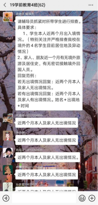 午后,我们的辅导员还会持续关注学生的动态,通过网格化管理模式,进行织网管理,确保既有重点,又全覆盖。同时,为防止境外疫情输入,辅导员逐个排查学生、家长及亲朋好友近一个月有无出入境情况,有无密切接触境外回国人员情况,对学生疫情信息进行排查、统计、上报。精准建立疫情防控学生信息台账,每天更新学生疫情信息,真正做到学生排查全覆盖,信息报送无遗漏。