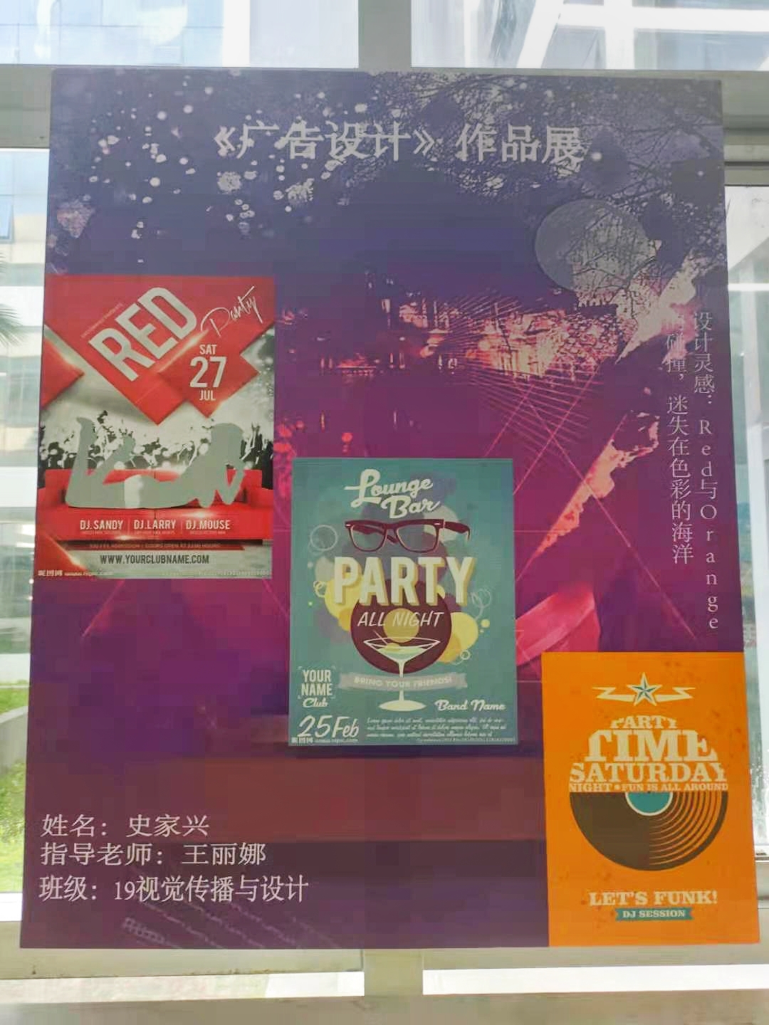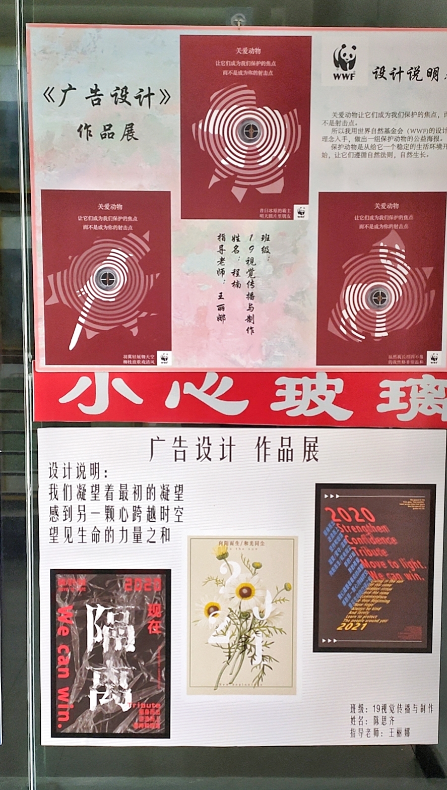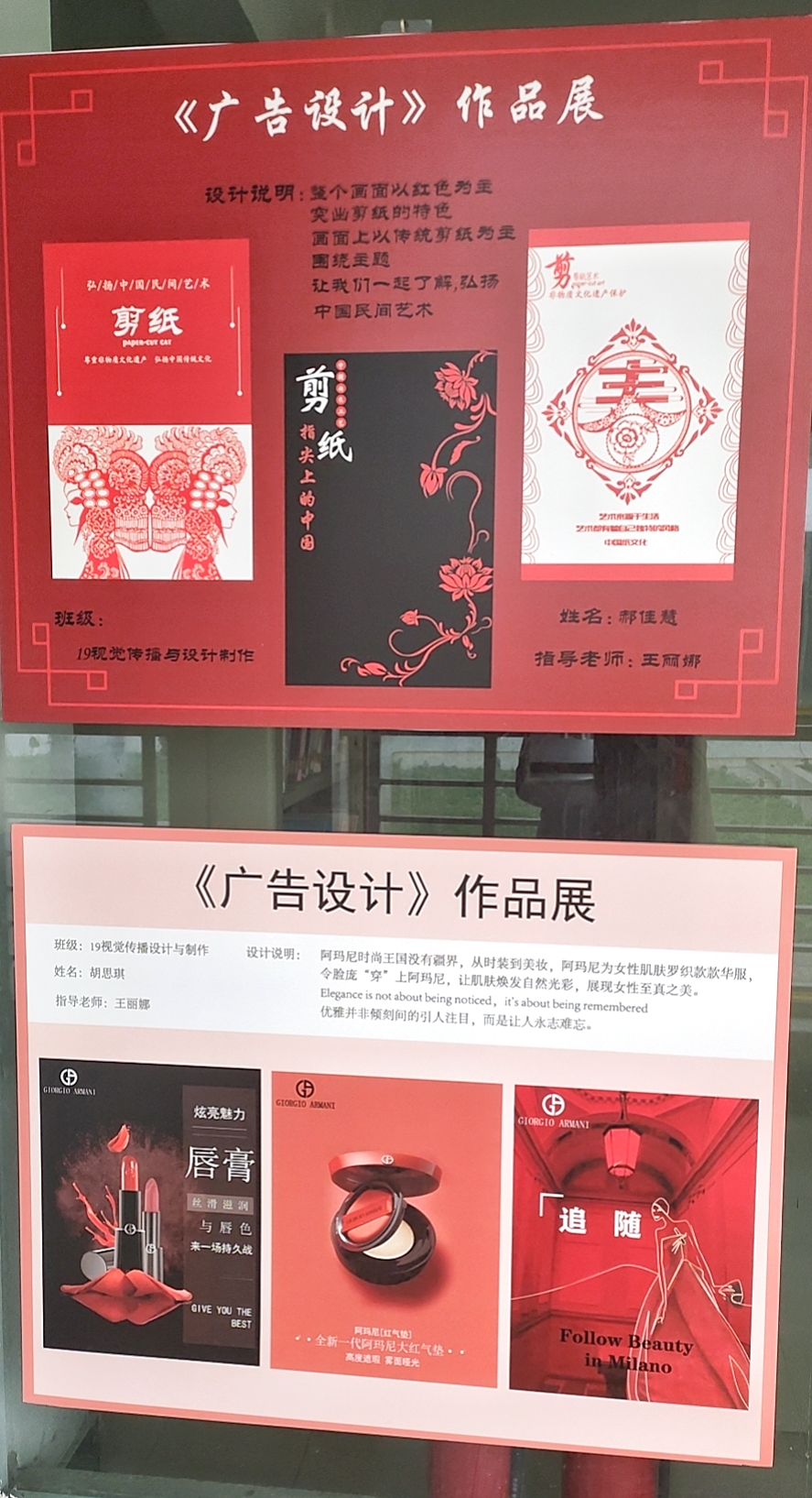 此次广告设计作品展,在王丽娜老师认真负责的指导和全体同学的努力奋斗下,共展出了34件作品。作品题材广泛,形式风格鲜明,充分体现了广告设计创作的教学成果。