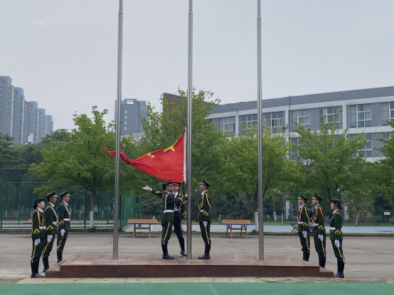 6点40分,升旗仪式开始,国旗护卫队迈着庄严而整齐的步伐走向国旗台,伴随着激昂雄壮的国歌声,鲜艳的五星红旗冉冉升起,迎风飘扬,全场师生向国旗行注目礼,深怀对祖国无限的热爱和崇高的敬意。