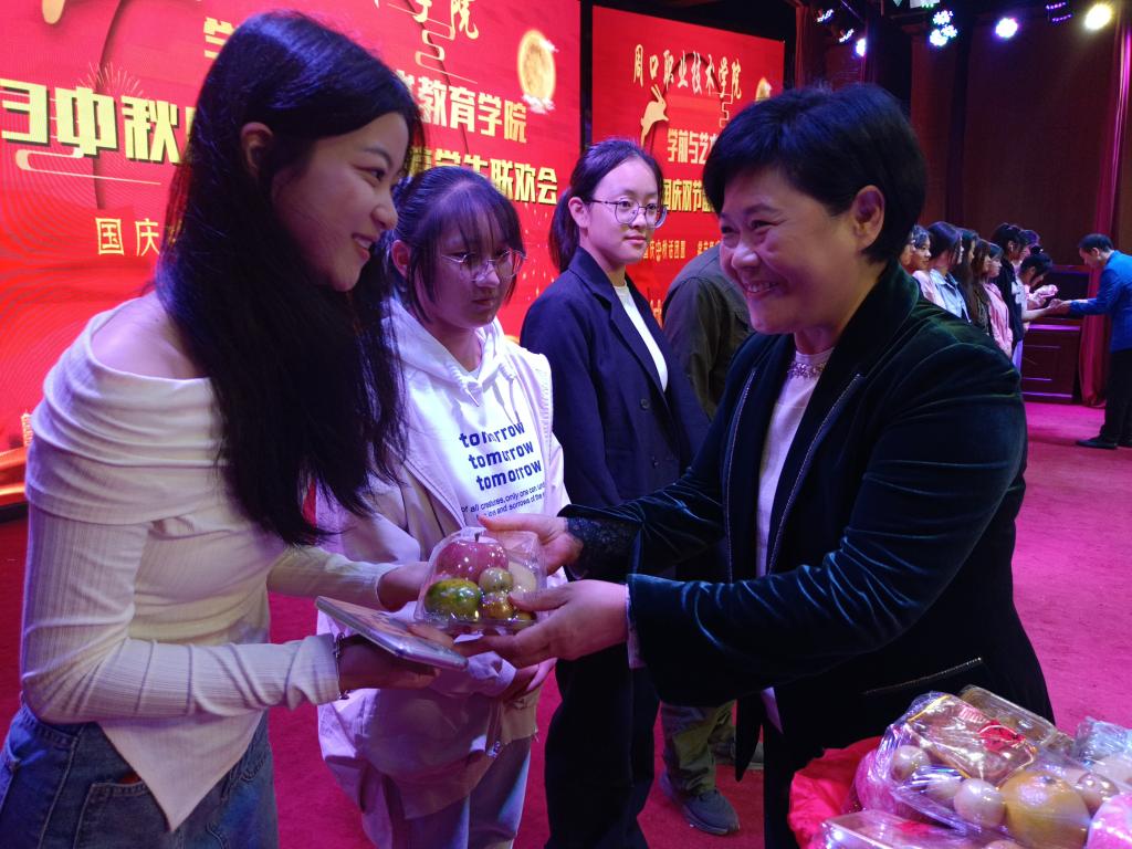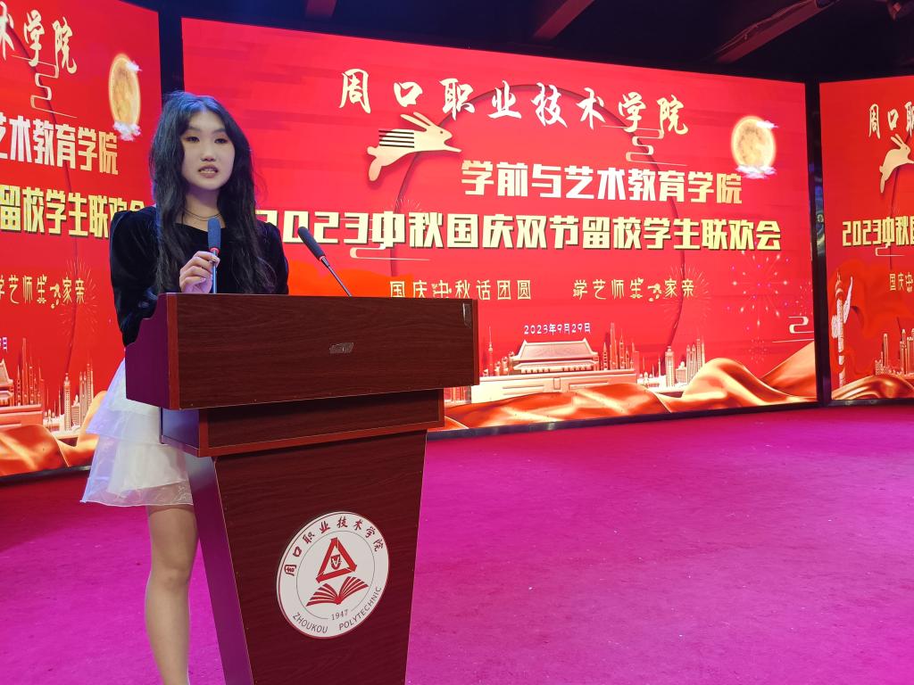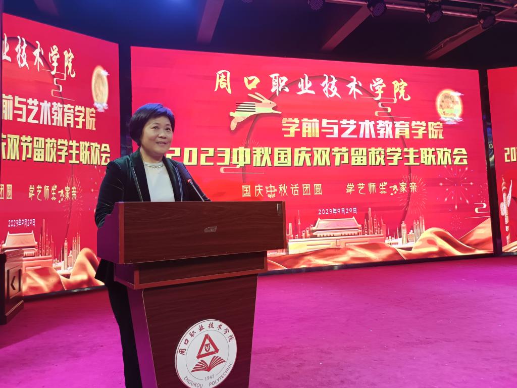 随后,留校学生代表23级学前教育三班李梅同学发言。首先,她对学院领导和老师们表示最诚挚的感谢。她通过本次学院举办的中秋国庆双节留校学生联欢会,感受到了“家”的温暖和关怀。她表示,在未来的学习和生活中,一定会更加努力,实现自己的梦想。