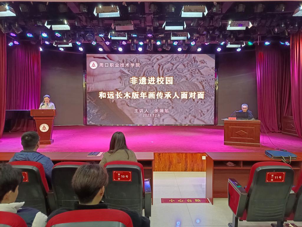 为了弘扬中华民族的优秀传统文化,提高大学生对保护非物质文化遗产的意识,增强文化自信,十大买球官方网站于12月6日下午邀请了周家口和远长木版年画传承人张瑞旭老师来校讲学。学院副院长杨晨、设计教研室主任董瑞、专业教师及设计专业的学生参加讲座,讲座由学院副院长耿润主持。