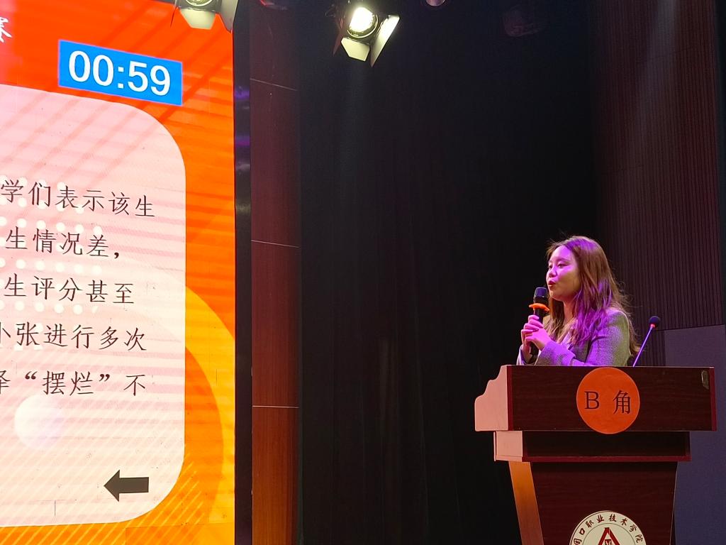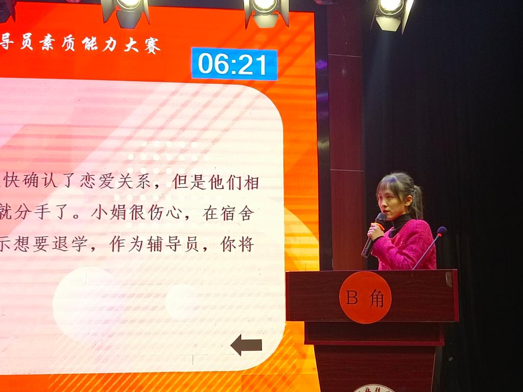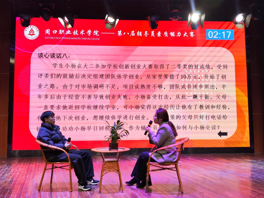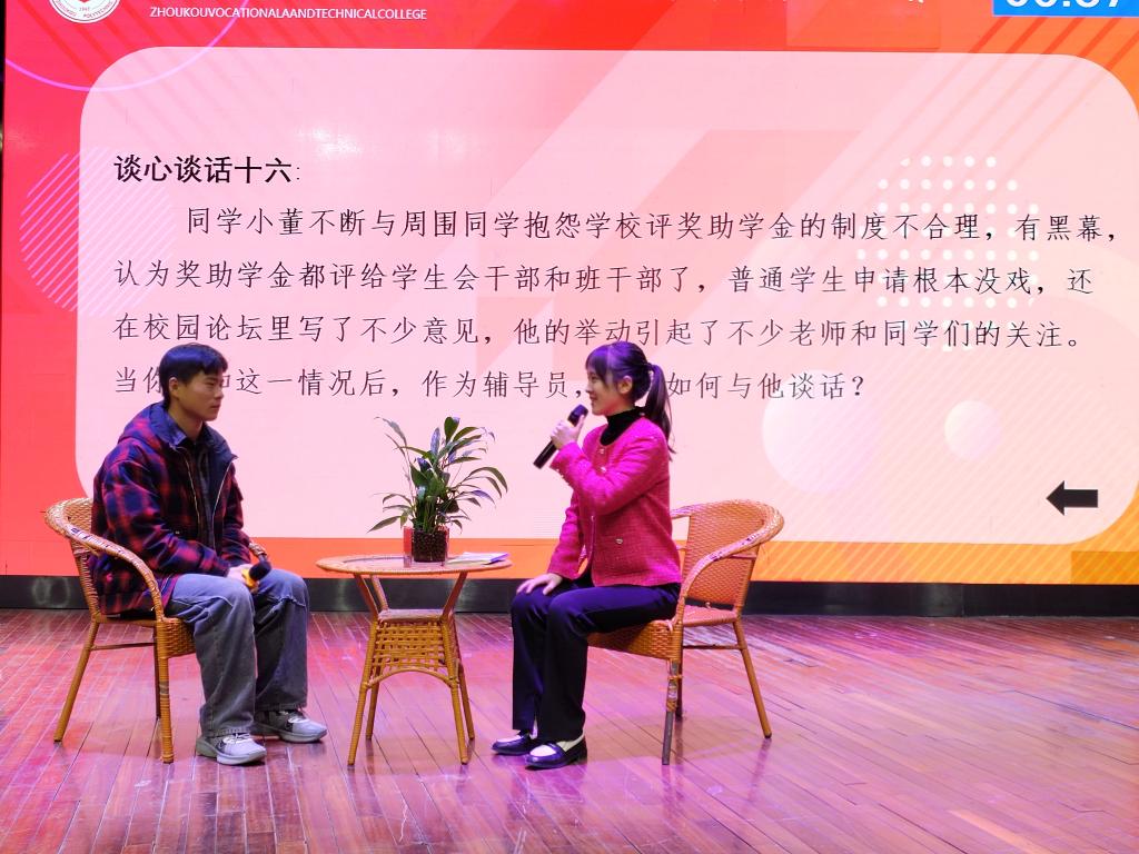 本次决赛共分为两个环节:案例研讨和谈心谈话,大赛紧扣辅导员工作实际,多方面展示辅导员的个人风采和知识储备。决赛现场,我院两位辅导员发挥出色,展示了出众的心理素质、扎实的理论功底和优异的临场应变能力。