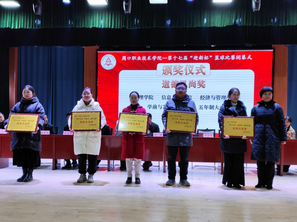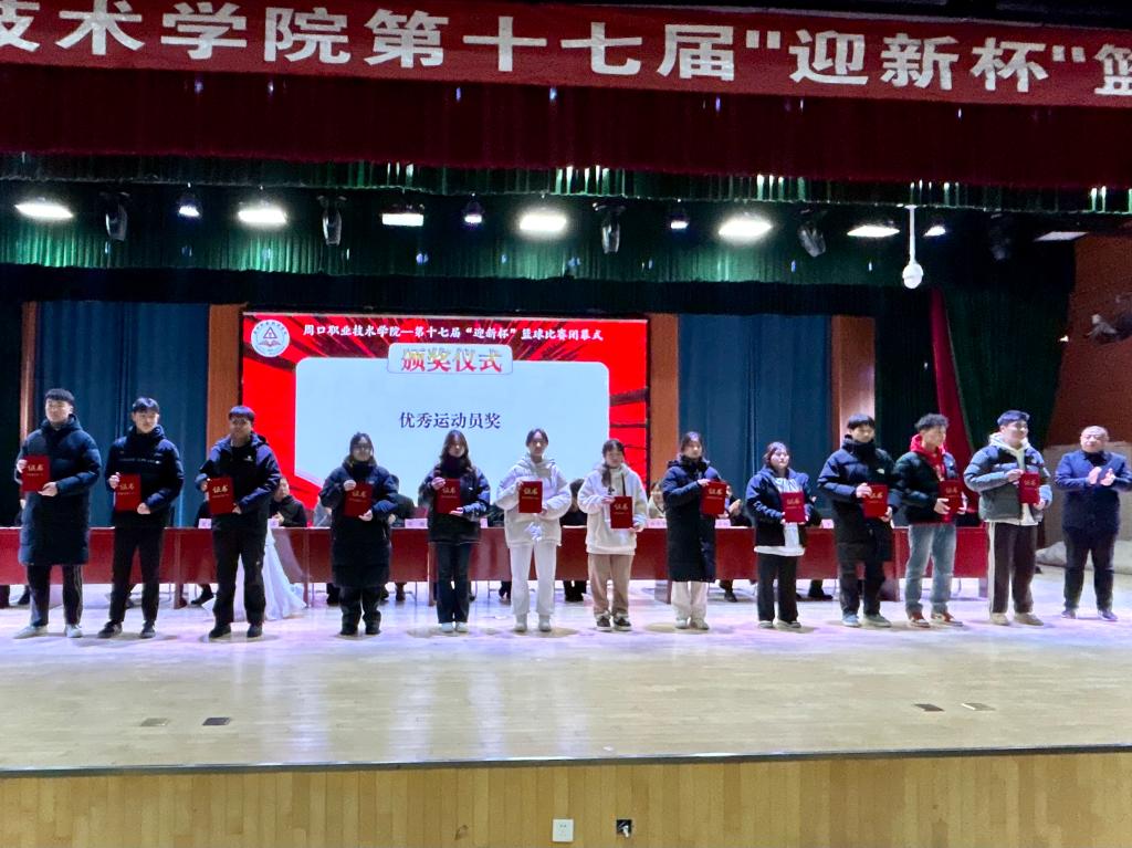 12月21日下午,买球赛十大平台在体育馆举行第十七届"迎新杯"篮球比赛闭幕式。我院学管办主任郑玉凡及篮球队员参加闭幕式。我院荣获本次比赛道德风尚奖,22级早期教育二班赵瑶、22级音乐表演一班赵乾提两位同学获优秀运动员奖。