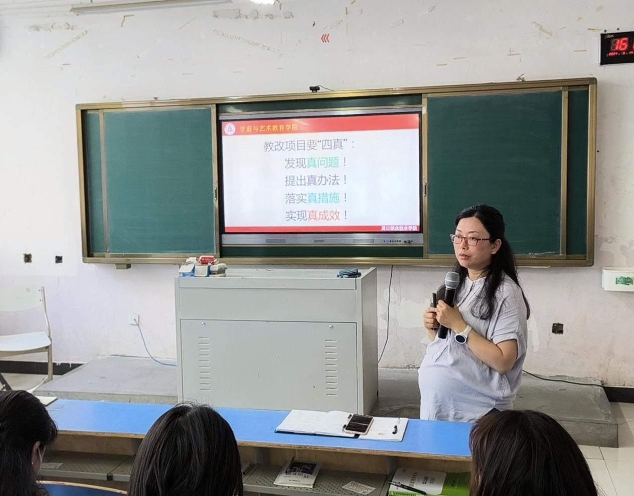 分享会上,副院长耿润首先强调了教学改革是提升教学质量和人才培养质量的关键举措,并向大家介绍了科研项目和教学改革项目的区别。然后,她以之前承担过的省级教学改革项目《ADDIE模型下高职课程思政建设探索与实践》为例,从项目提出的背景、解决的主要问题、项目实施方案、项目主要成果、项目成果特色、成果应用成效及项目不足之处等六个方面,向各位老师详细分享了教学改革的经验。最后,她总结道,教学改革是一项长期工作,任课教师在日常教学工作中要积极树立教改意识,善于发现教学中存在的问题,并思考解决问题的途径和策略,在此基础上凝练总结,以形成教学改革项目,同时,学院也要对教改项目有培育意识,鼓励专业教师以课程为单位形成教学团队开展课程建设和教研活动。总之,教学改革要研究真问题、提出真办法、落实真措施、实现真成效。
