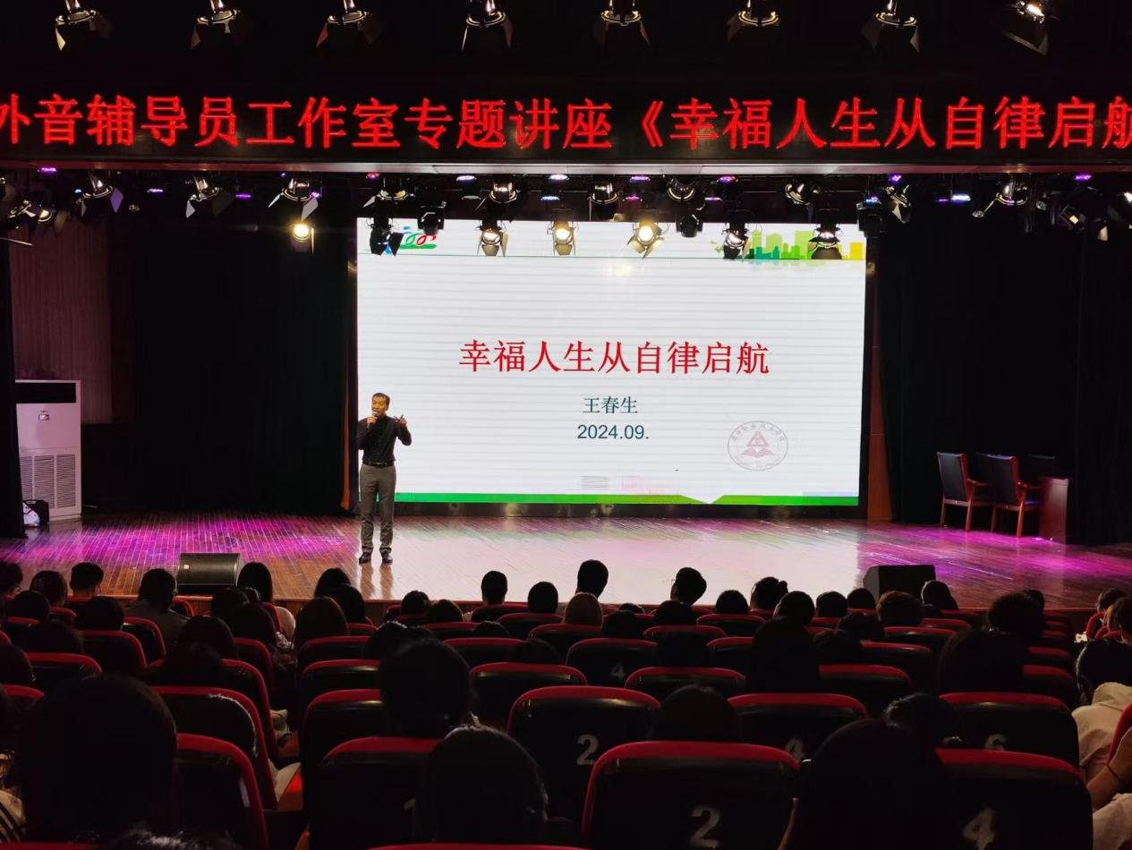 为提高同学们的自律能力,激发热爱生活、崇尚健康的正确价值观,9月28日晚上,十大买球官方网站(纺织服装学院)画外音辅导员工作室在砺德厅举行《幸福人生从自律启航》专题讲座。副院长杨晨、学管办主任郑玉凡、2024级全体辅导员及600余名新生参加讲座,学院党总支书记王春生主讲。