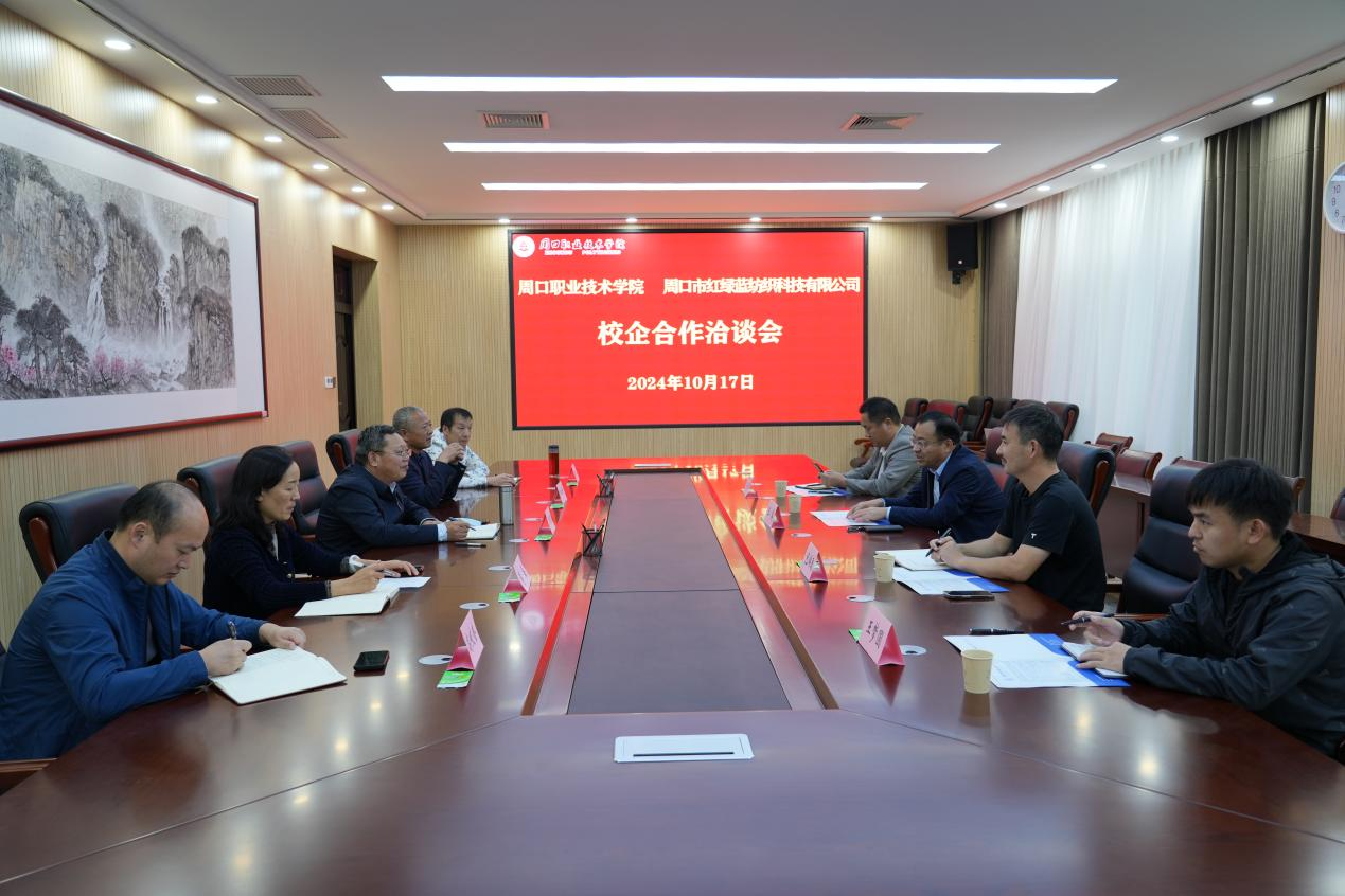 10月17日,买球赛十大平台与周口市红绿蓝纺织科技有限公司在校第六会议室举行校企合作洽谈会。校党委副书记李明臣、商水县副县长王宾出席会议,周口市红绿蓝纺织科技有限公司董事长包焕康、校宣传部部长万四新、纺织服装学院党总支书记王春生、院长高岐奎参加洽谈会。教务处处长李嘉主持会议。