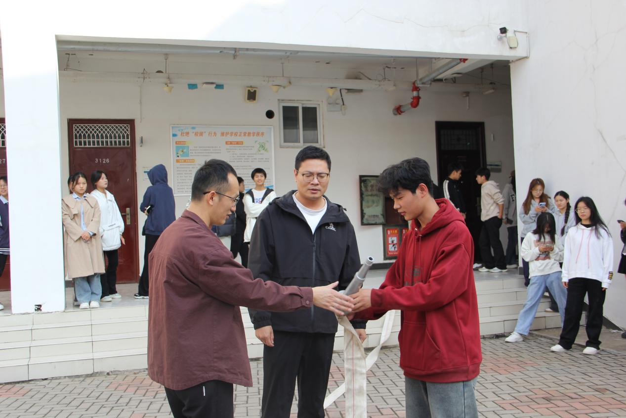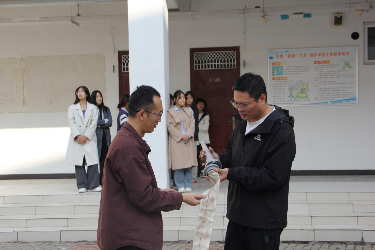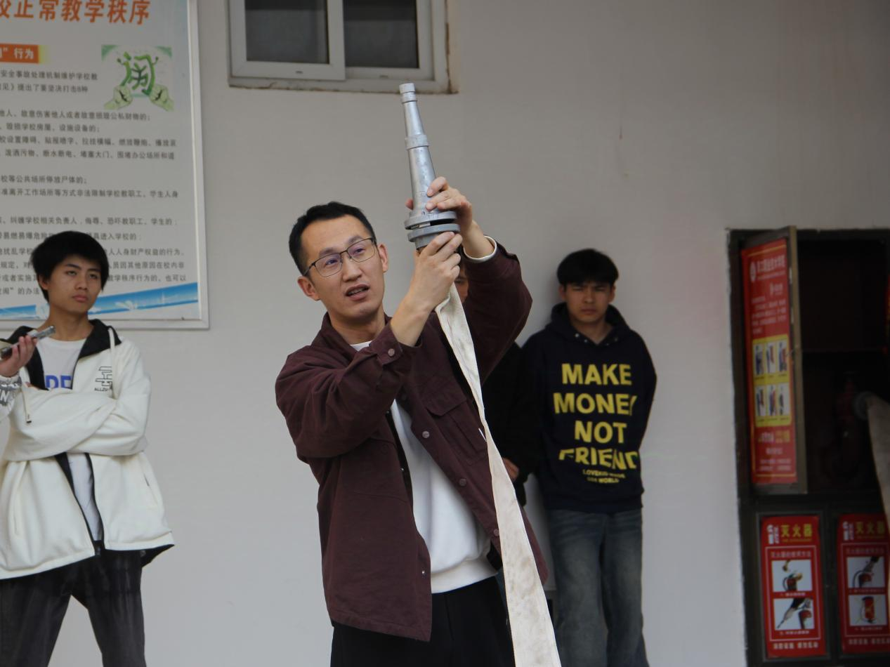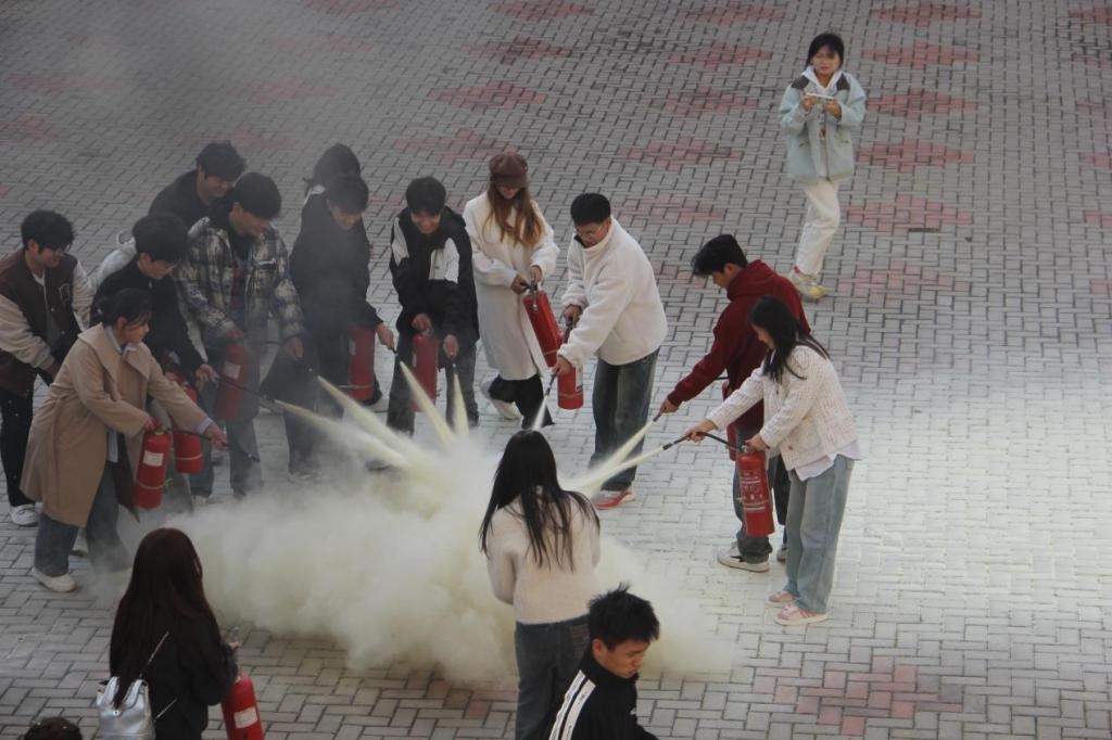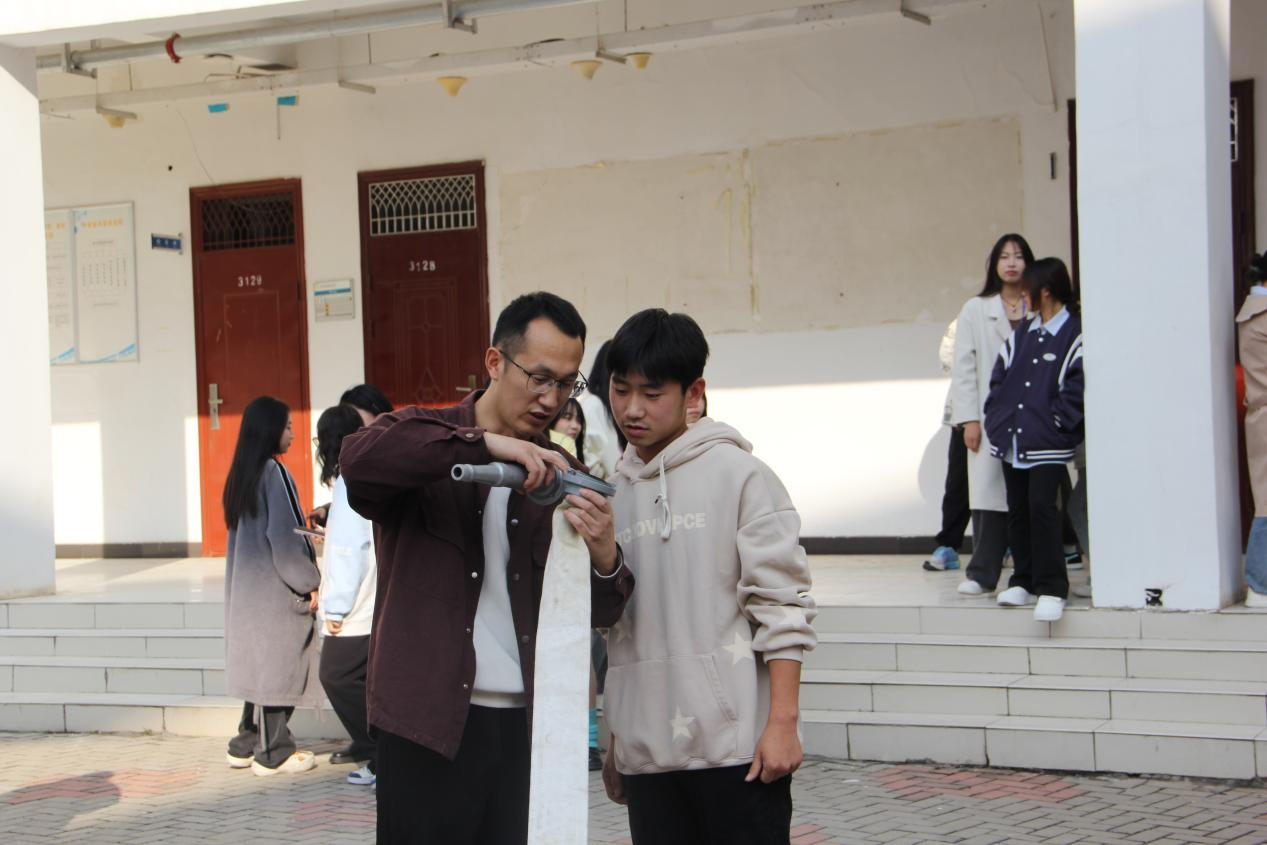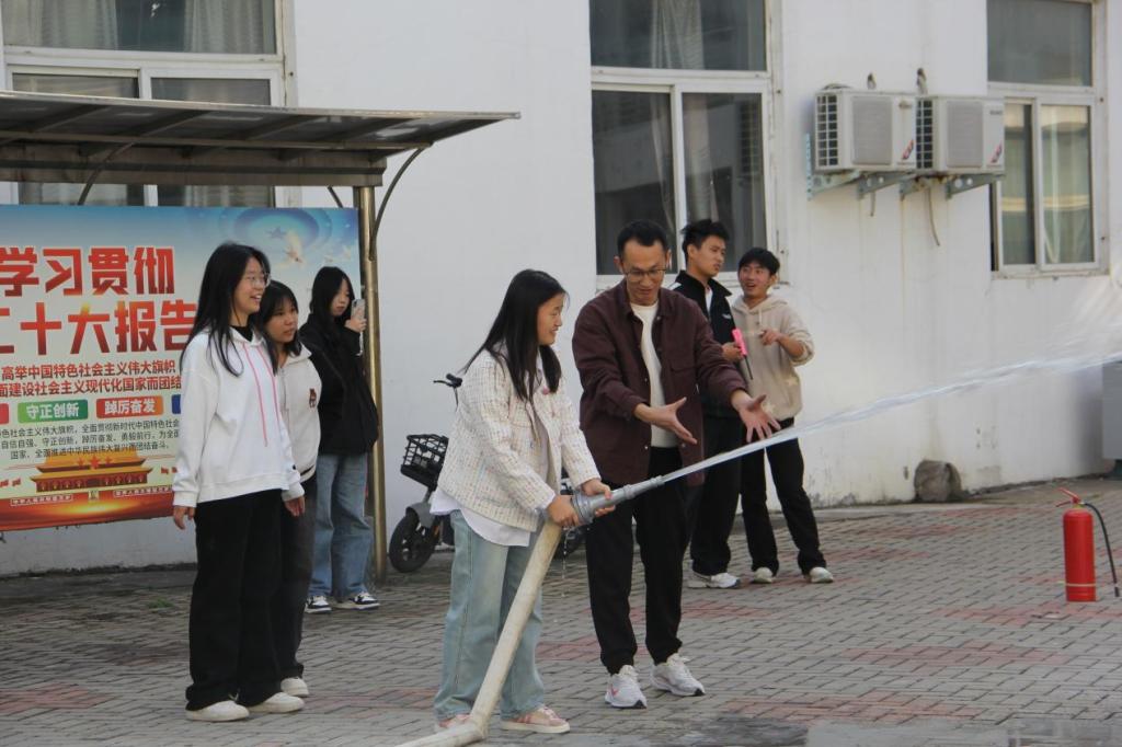 在模拟火情现场,校保卫处于浩老师不仅为学生们详细讲解了干粉灭火器的使用方法和注意事项,还展示了消防水带和水枪的连接、使用方法以及水带的铺设和收卷方法。在演练人员的指导下,大家通过实操演练,不仅掌握了初期火灾的扑救方法,还增长了预防火灾的知识和应对危机时的自救办法。