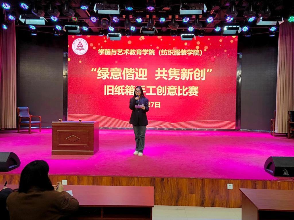 为丰富校园文化生活,提升学生的专业技能和创新能力,提高环保意识和综合素养。11月27日晚,十大买球官方网站(纺织服装学院)在艺术演播厅开展“绿意偕迎,共隽新创”旧纸箱手工创意比赛。学院团总支书记刘馨馨、辅导员李晓悦及学生代表担任评委。