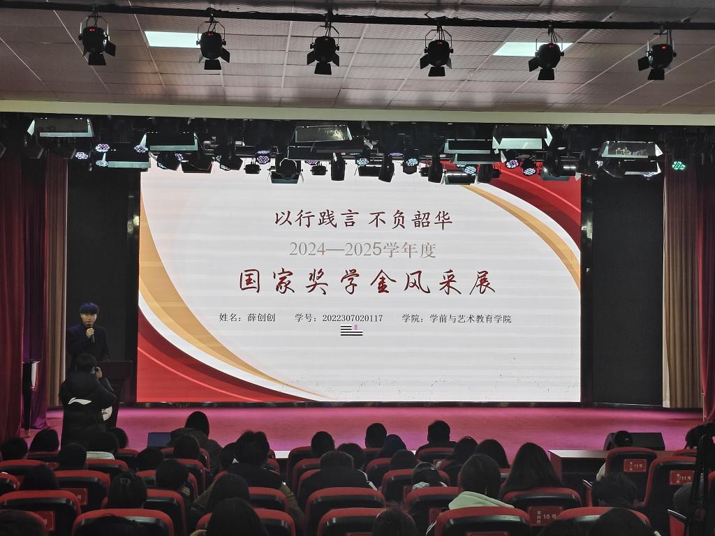 我院2022级音乐表演01班的薛创创同学作为国家奖学金获得者和学生代表,在风采展中进行了主题分享。他围绕学科竞赛、学习经验和成长经历展开,结合个人实际,生动讲述了如何科学规划学习、克服挑战的心得体会,以及未来的目标愿景。