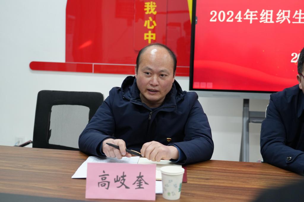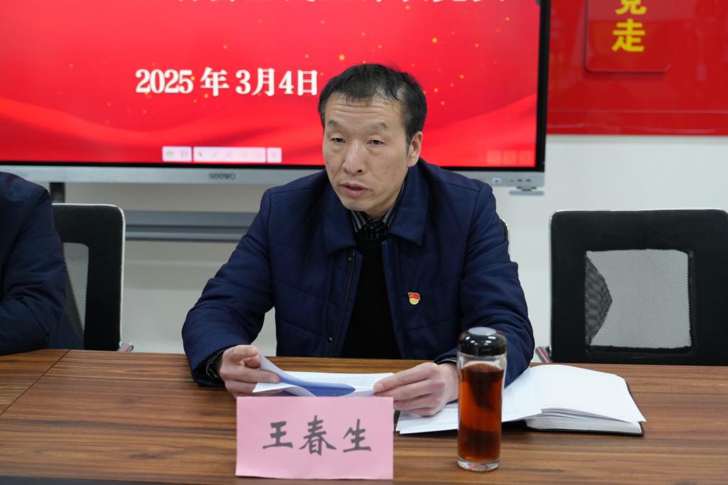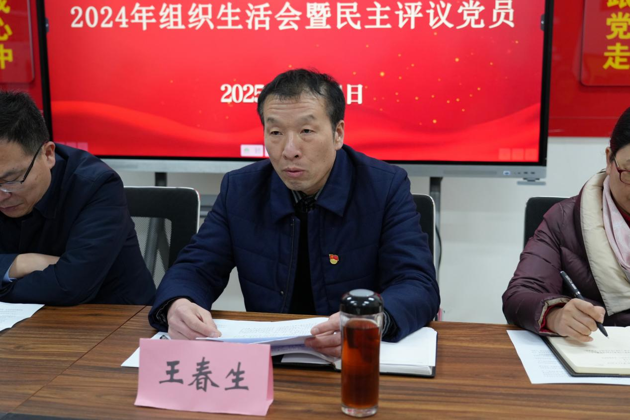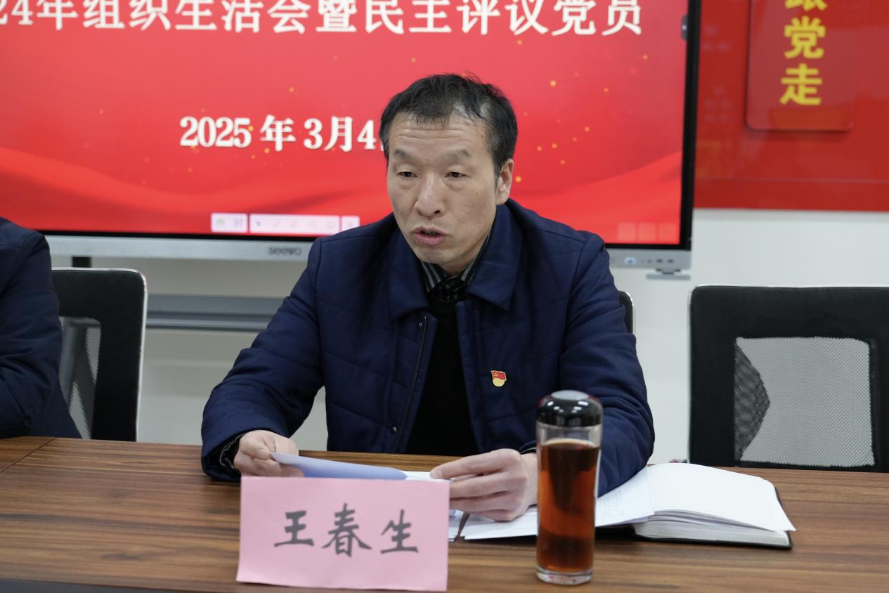 王春生汇报党总支2024年工作完成情况,并代表党总支作对照检查,为下一步的打算做出了要求:强化政治功能,深入推进党风廉政建设,紧扣中心任务,推动各项事业向高质量发展迈进。