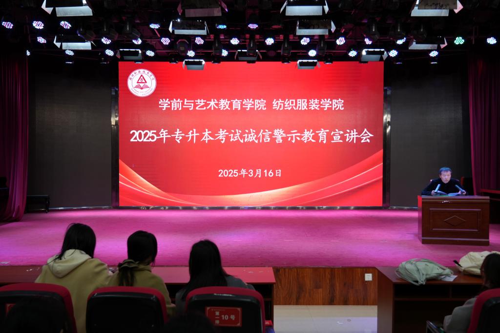 为端正考风,严肃考纪,3月16日上午,十大买球官方网站(纺织服装学院)在艺术演播厅召开2025年专升本考试诚信警示教育宣讲会。学院领导班子、22级辅导员以及学院22级全体专升本学生参加会议。
