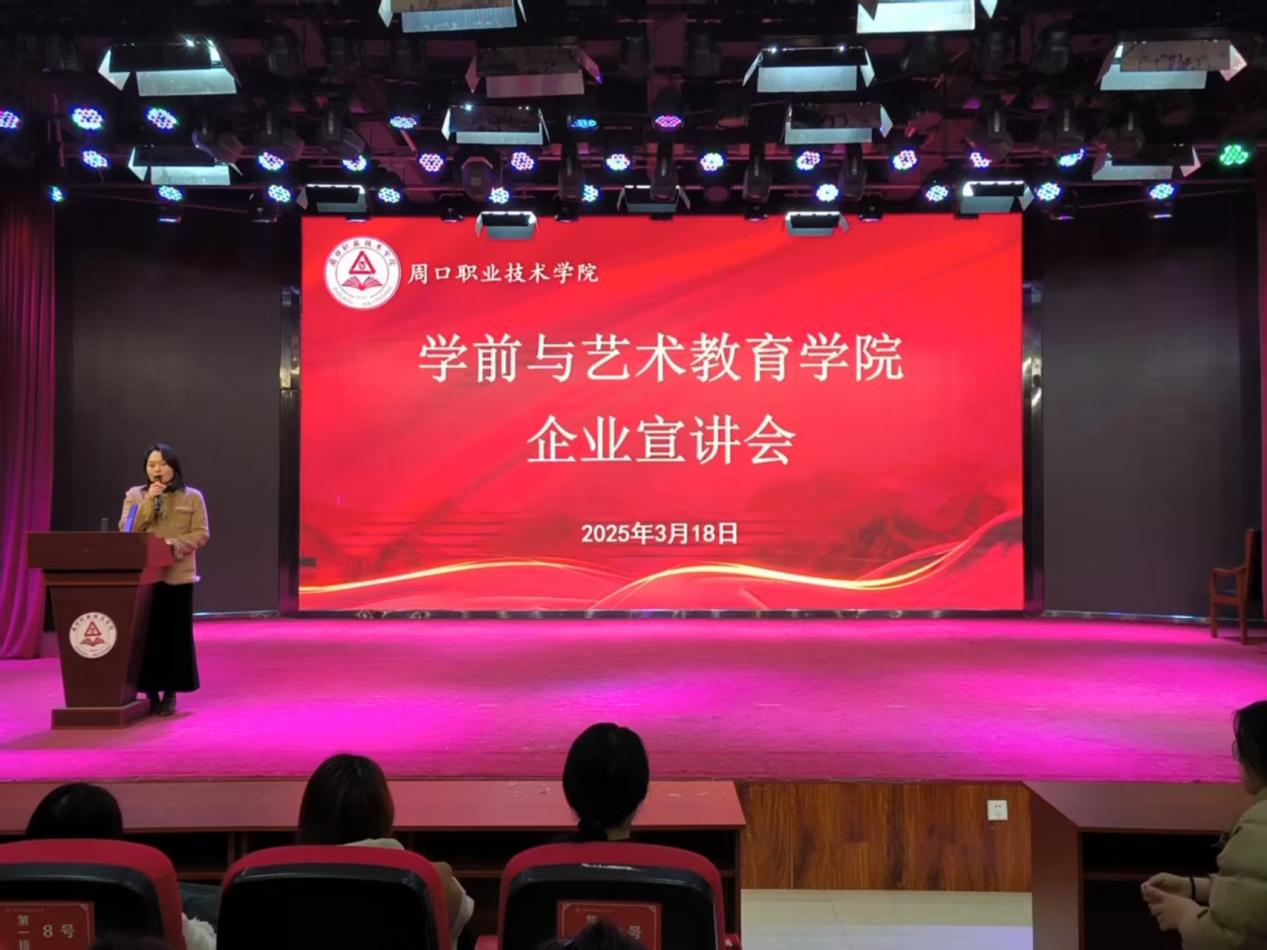 为拓展我院毕业生就业渠道,增强个人就业能力。3月18日下午,十大买球官方网站在艺术演播厅召开2025届毕业生企业专场宣讲会,周口贵和幼儿园园长陈改革受邀宣讲,22级、23级学前教育、早期教育专业学生参加宣讲会。