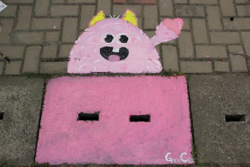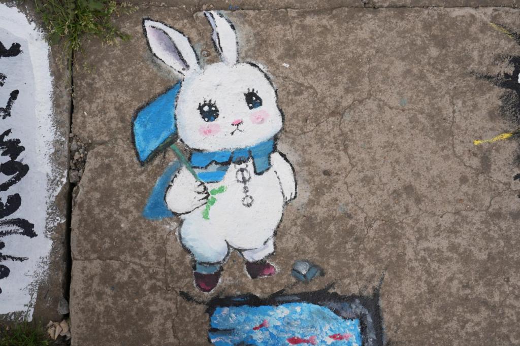 瞧!原本单调无色的地面,如今变成了一本巨型的童话绘本,学生们不畏炎炎烈日,用膝盖当画板、汗珠作调色剂,把海绵宝宝、史迪奇等各种各样的卡通图案统统“种”进了滚烫的地面。