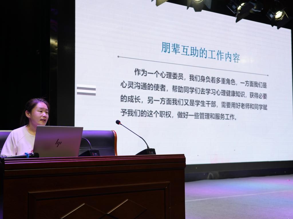 会上,刘青老师详细介绍了心理指导中心的工作内容,并围绕心理委员的朋辈互助技巧、心理援助与干预要点展开讲解。她强调同学之间互帮互助的重要性,提醒大家要密切关注身边同学的身心变化,并结合具体案例,让在场学生深刻认识到关爱他人的意义;同时,她还分享了日常帮助同学的实用方法,使心理委员进一步明晰自身的工作职责。