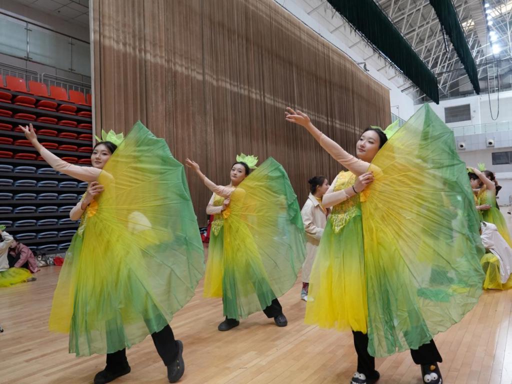 舞蹈节目《春之歌》随悠扬旋律蹁跹登场。学子们化身春日精灵,以轻盈舞步变幻队形,身姿柔美灵动,手中扇面开合摇曳,共同舞出一幅生机盎然的春日画卷,让全场观众沉浸其中。