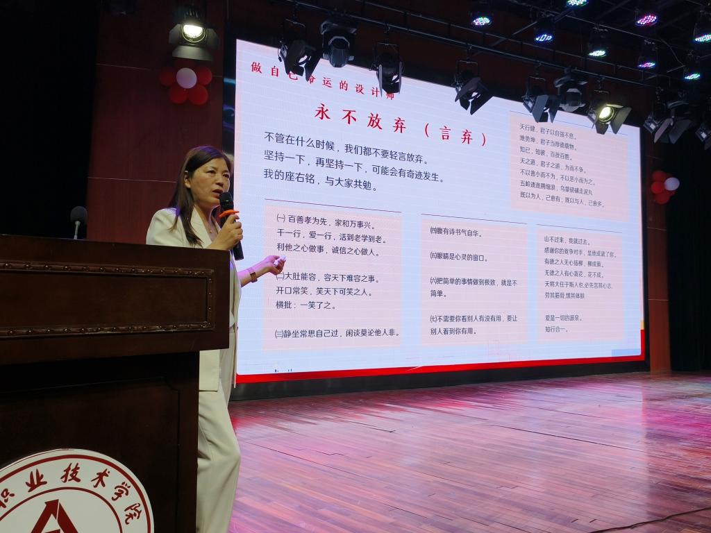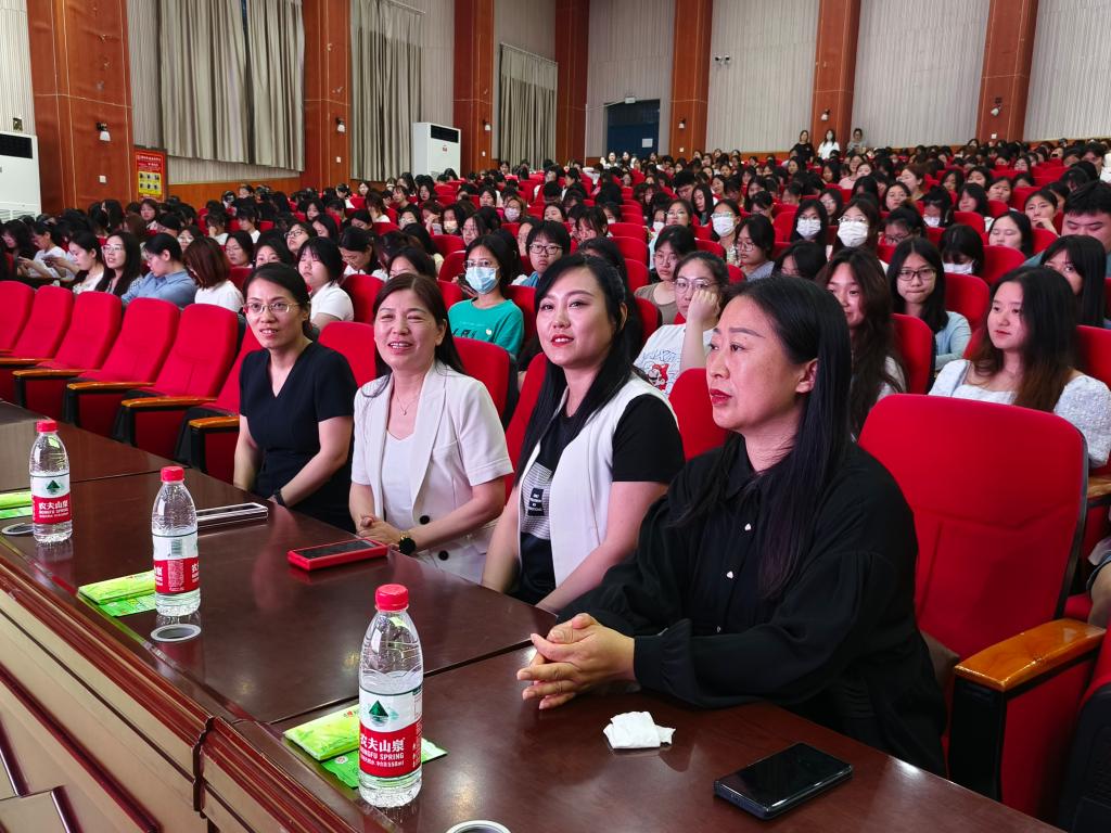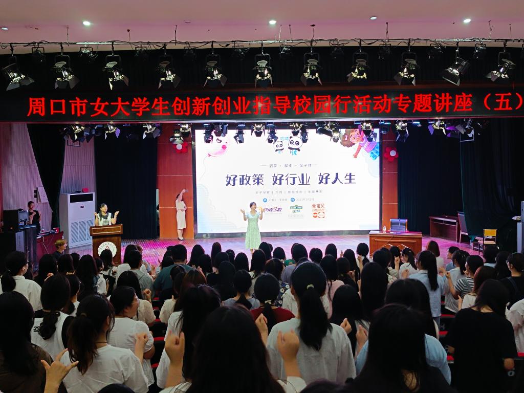 市女企业家协会副会长、周口早教创始人王欣欣通过一个小游戏开始与同学们分享其创业之路的初心与坚守,用真实具体的案例讲述了自己确定人生目标和做出重要选择的故事,最后分享了幼儿老师面试技巧和实用方法,为即将走出校门的女大学生提供了就业创业思路。