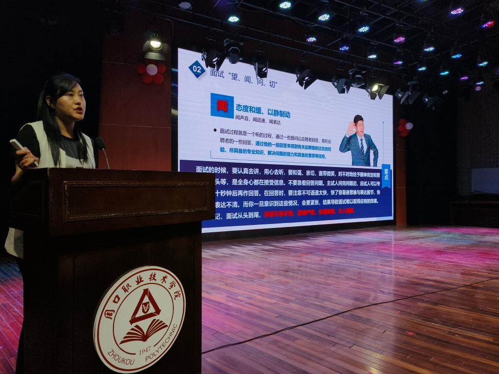 接着由市女企业家协会执行会长、市人大代表宗华给大家做主题为《做自己命运的设计师》的讲座。询问在座女大学生的就业意向,通过自身成长经历及个人人生感悟激励同学们,与同学们进行了热情的互动,积极与大家沟通、洽谈,根据其就业意向给予全方位就业指导。