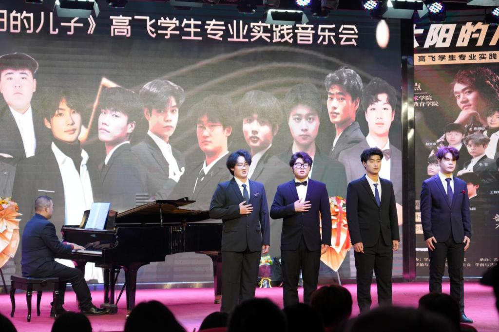 音乐会后段,高飞老师携手学生共同演绎了《月亮代表我的心》和《太阳的儿子》两首经典之作。师生之间的默契配合,宛如琴瑟和鸣,将现场氛围推向了顶点。最后,在观众的掌声中,全场齐唱《我和我的祖国》为这场音乐会画上了完美的句号。